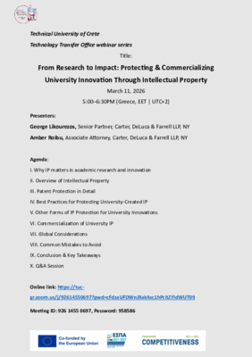 Το Γραφείο Μεταφοράς Τεχνολογίας Πολυτεχνείου Κρήτης διοργανώνει την Τετάρτη 11 Μαρτίου 2026 και ώρα 5.00μμ, ένα διαδικτυακό σεμινάριο με θέμα την Πνευματική Ιδιοκτησία Intellectual Property – IP) και τον ρόλο της στην ακαδημαϊκή έρευνα και την καινοτομία.