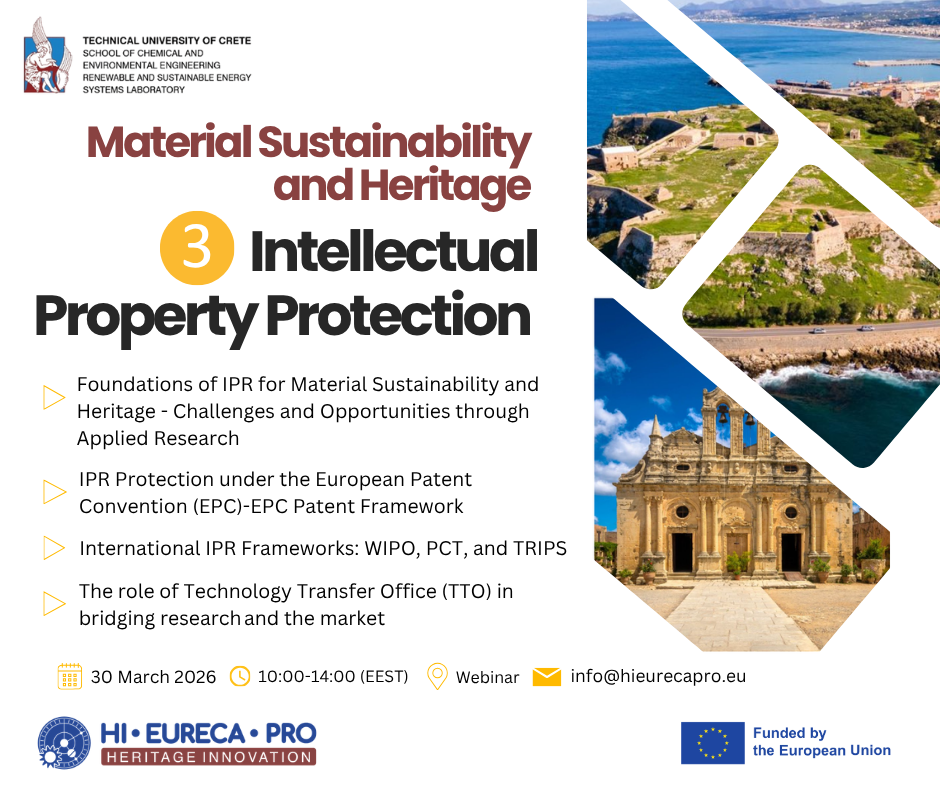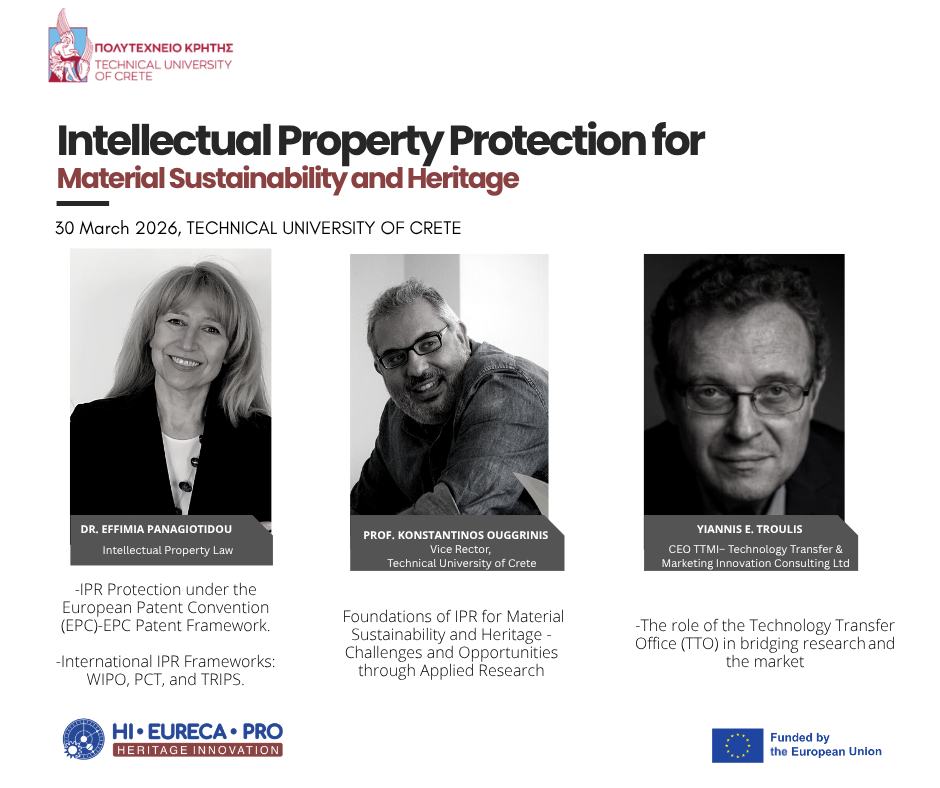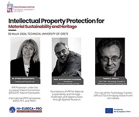 Στις 30 Μαρτίου 2026 και ώρα 10.00-14.00 το Εργαστήριο Ανανεώσιμων και Βιώσιμων Πηγών Ενέργειας του Πολυτεχνείου Κρήτης διοργανώνει το τρίτο μέρος της σειράς εργαστηρίων με θέμα: “Material Sustainability in Cultural Heritage patents”.